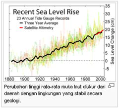 Ketika atmosfer menghangat, lapisan permukaan lautan juga akan menghangat, sehingga volumenya akan membesar dan menaikkan tinggi permukaan laut. Pemanasan juga akan mencairkan banyak es di kutub, terutama sekitar Greenland, yang lebih memperbanyak volume air di laut. Tinggi muka laut di seluruh dunia telah meningkat 10 - 25 cm (4 - 10 inchi) selama abad ke-20, dan para ilmuan IPCC memprediksi peningkatan lebih lanjut 9 - 88 cm (4 - 35 inchi) pada abad ke-21.